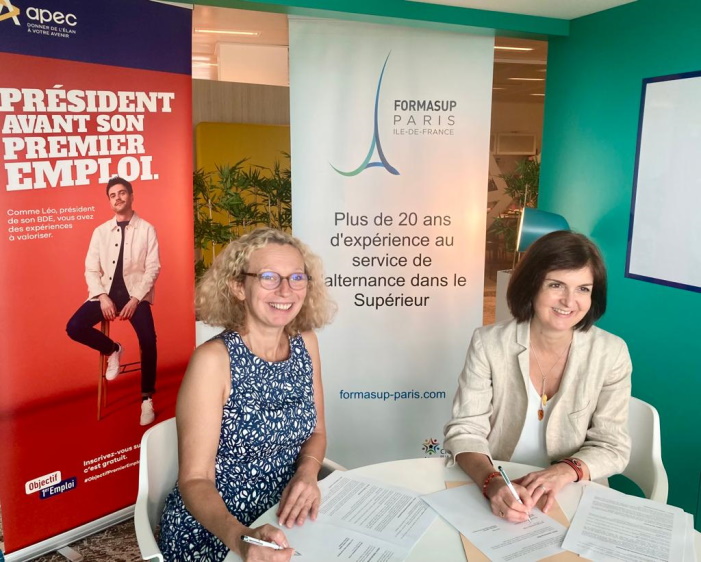 Valérie CANTAT-LAMPIN, Directrice Générale de FORMASUP PARIS IDF et Dominique LARGAUD, déléguée régionale APEC IDF pour Gilles GATEAU, ont signé cet après-midi une convention (merci Guillemette BEAUDOIN-KADAM) qui formalise une collaboration initiée il y a 2 ans auprès des alternants diplômés des 20 partenaires académiques de FORMASUP PARIS IDF et, depuis juin dernier, auprès des candidats à l’alternance.