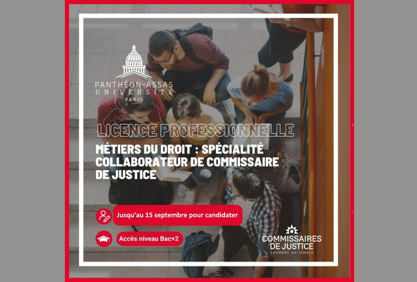 FORMASUP PARIS IDF, partenaire apprentissage de l'université Paris-Panthéon-Assas, est très fier d'avoir accompagné l'équipe pédagogique en lien avec la CNJC (signataire en juin 2023 d'une convention avec l'université) et la Chambre régionale des commissaires de justice de la cour d’appel de Paris, dans la création de cette nouvelle Licence professionnelle en apprentissage.