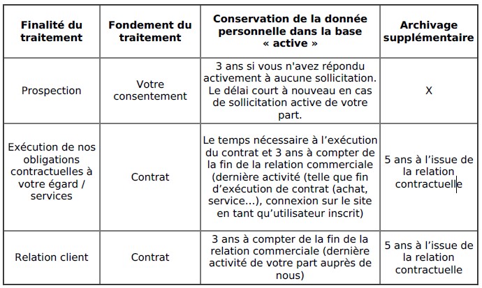 Vos données personnelles sont conservées pour le temps nécessaire aux besoins de leur traitement, de notre relation client le cas échéant et l’exécution des contrats et dans les limites spécifiquement édictées réglementairement ; nous sommes susceptibles de conserver vos données personnelles en archivage pour les besoins de conservation d’éléments justificatifs comptables, fiscaux ou probatoires le temps des prescriptions applicables. A titre d’exemple, nous vous indiquons ci-après les durées de conservation s’appliquant aux traitements suivants (sous réserve de la réglementation imposant un temps de conservation différencié) :