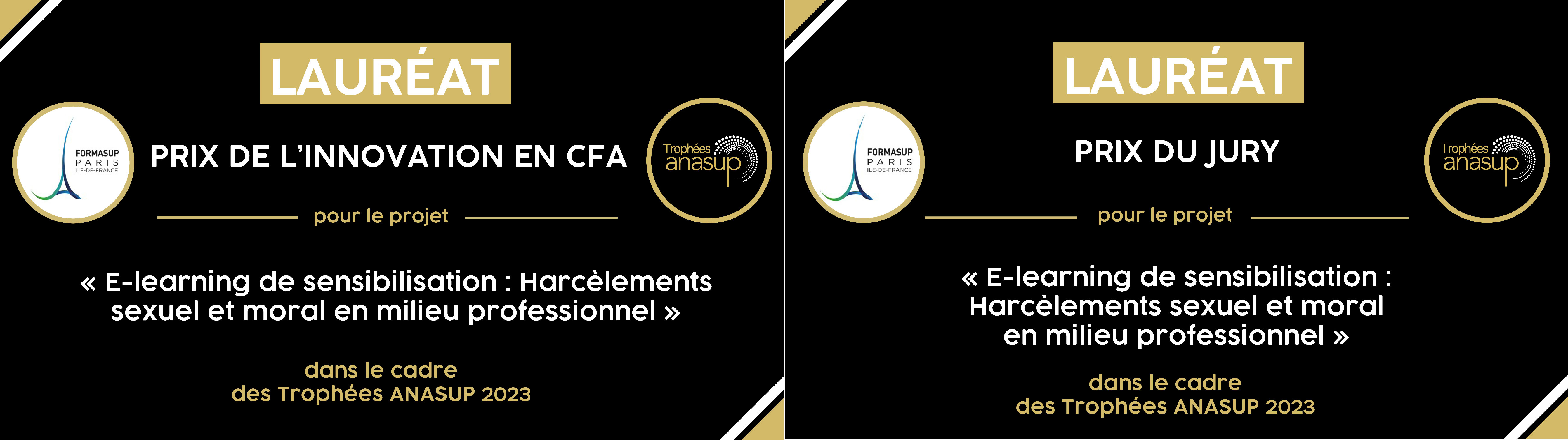 Jeudi 7 juillet 2023 : notre E-learning de sensibilisation « Harcèlements sexuel et moral en milieu professionnel » remporte le Prix Innovation en CFA ainsi que le Prix du Jury dans le cadre des Trophées de l’ANASUP 2023. Double merci au Jury !