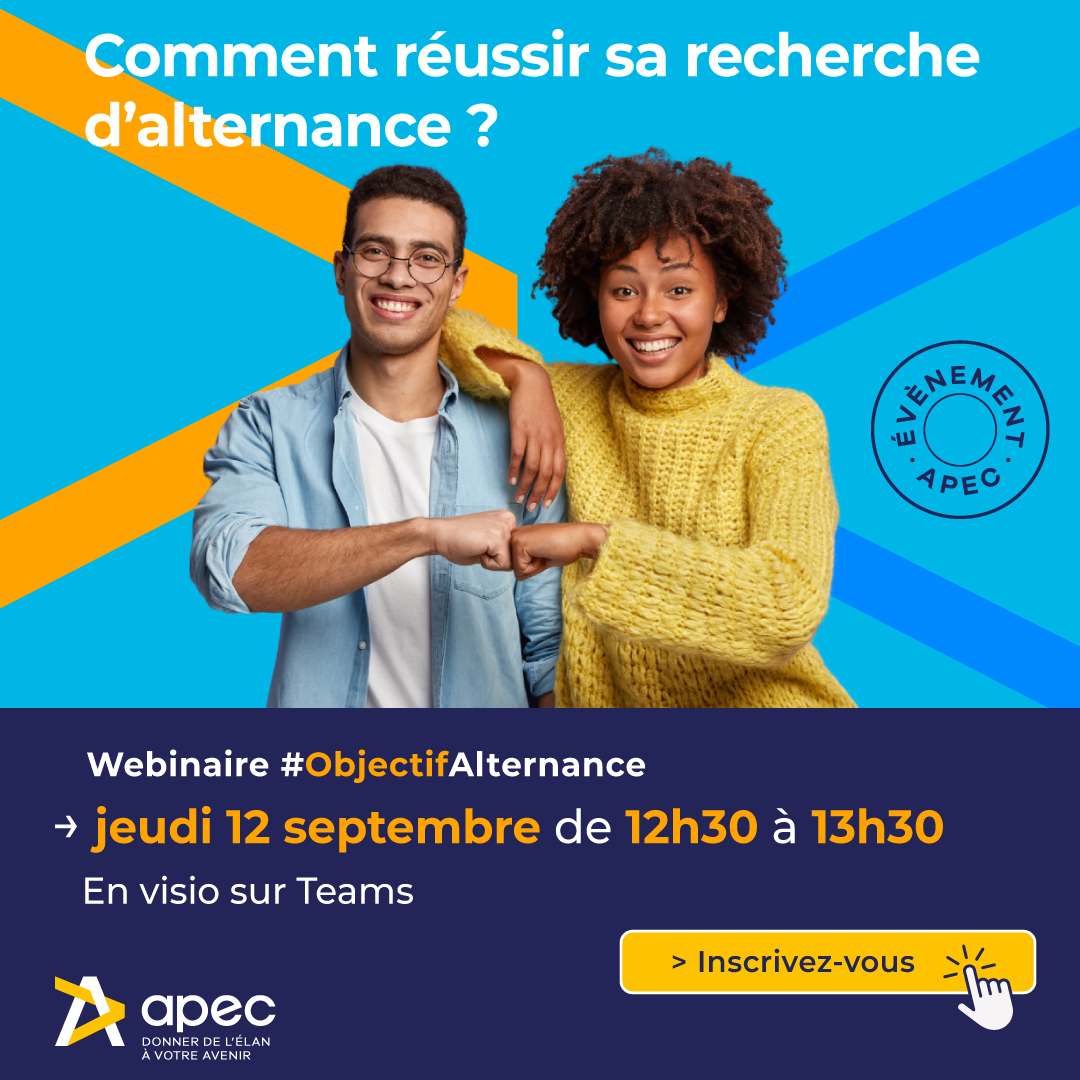L'Apec - Association Pour l'Emploi des Cadres t'invite à participer à un live spécial #ObjectifAlternance le 12 septembre de 12h30 à 13h30